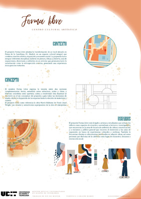El proyecto Forma Libre plantea la transformación de un local ubicado en Paseo de la Castellana, 81, Madrid, en un espacio cultural integral que combina creación artística, exposición y encuentro social. La propuesta busca integrar diferentes disciplinas (talleres de pintura, dibujo y alfarería, sala de exposiciones, showroom y cafetería) en un entorno que promueva tanto la socialización como la introspección creativa, generando una experiencia única para los visitantes. La inspiración conceptual proviene de la obra March Balloons de Frank Lloyd Wright, donde la geometría y el color se convierten en un lenguaje visual capaz de generar movimiento, emoción y equilibrio. En este sentido, el proyecto busca traducir un lenguaje gráfico abstracto a un espacio arquitectónico y sensorial, donde cada planta tiene una identidad propia, pero mantiene un diálogo con la otra. Se estructuran dos medias plantas: la planta alta, concebida como el espacio de la Forma, en donde se concentra la energía social y la actividad dinámica; y la planta baja, que representa lo Libre, un entorno de calma, silencio y creatividad. Esta dualidad permite que el visitante experimente un recorrido emocional y espacial: desde la vitalidad y el ruido de la cafetería hasta la introspección y el trabajo creativo de los talleres y la sala de exposiciones. El proyecto busca, además, que la arquitectura y el diseño interior no solo cumplan funciones prácticas, sino que comuniquen de manera simbólica los conceptos de Forma y Libre, utilizando elementos como la luz, el color, la geometría y los materiales para crear un lenguaje propio que articule todo el espacio.