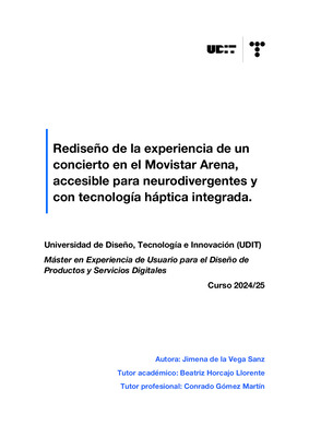 Este proyecto busca mejorar la interacción y participación de personas con hipersensibilidad sensorial o neurodivergencias en contextos donde predominan los estímulos visuales y sonoros. Para ello, se ha diseñado una experiencia que redefine la manera en que estas personas viven un concierto, desde que compran una entrada hasta que vuelven a su casa tras haberlo disfrutado. La experiencia se ha diseñado pensando en el Movistar Arena como recinto piloto para su posible implementación, en colaboración con Telefónica. Va acompañada de una solución físico-háptico digital—que integra la tecnología háptica con el diseño digital—compuesta por una app y una pulsera háptica que se sincronizan durante la experiencia, sirviendo como herramientas de apoyo que alivian la ansiedad anticipatoria o la carga cognitiva que supone para muchas de estas personas asistir a conciertos en salas muy masificadas y sometidas a multitud de estímulos constantes.