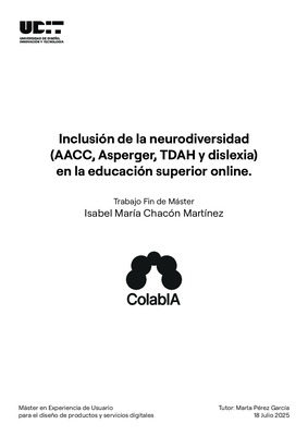 Este proyecto nace debido a la necesidad de incluir la neurodiversidad en el ámbito de la educación superior online, en un entorno en el cual las personas neurodivergentes siguen enfrentando barreras que dificultan su inclusión. Uno de los objetivos principales es conseguir el diseño de una interfaz adaptada a las características de estos usuarios durante su proceso de aprendizaje, aplicando un enfoque user-centered, priorizando así las necesidades del usuario. Para ello, se ha implementado una metodología UX, basada en design thinking, en cinco fases: (I) empatizar, (II) definir, (III) Idear, (IV) prototipar y (V) validar, utilizando técnicas como entrevistas, encuestas, benchmarks y testeo RITA. De este proceso se llega a la conclusión de que, un aspecto crucial es el diseño de un prototipo de interfaz que guie y apoye durante todo el proceso a personas con TDAH en los grupos de trabajo de la educación superior online. La memoria del proyecto se ha organizado en cuatro grandes bloques: (I) investigación y análisis, (II) ideación, (III) prototipado y propuesta y (IV) diseño y testeo de la solución elegida